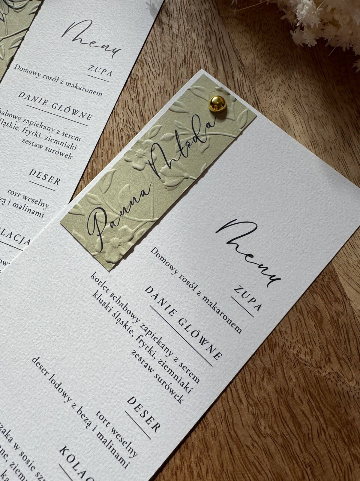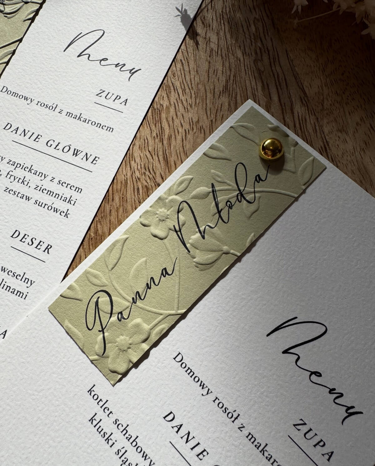 Wyjątkowe menu wykonane z białego, fakturowanego papieru, z doczepioną u góry winietką przymocowaną złotym nitem w formie kulki. Minimalistyczna, stojąca forma menu łączy funkcjonalność z eleganckim designem, a winietka subtelnie oznacza miejsce dla gościa, dodając stołowi klasy i spójności.