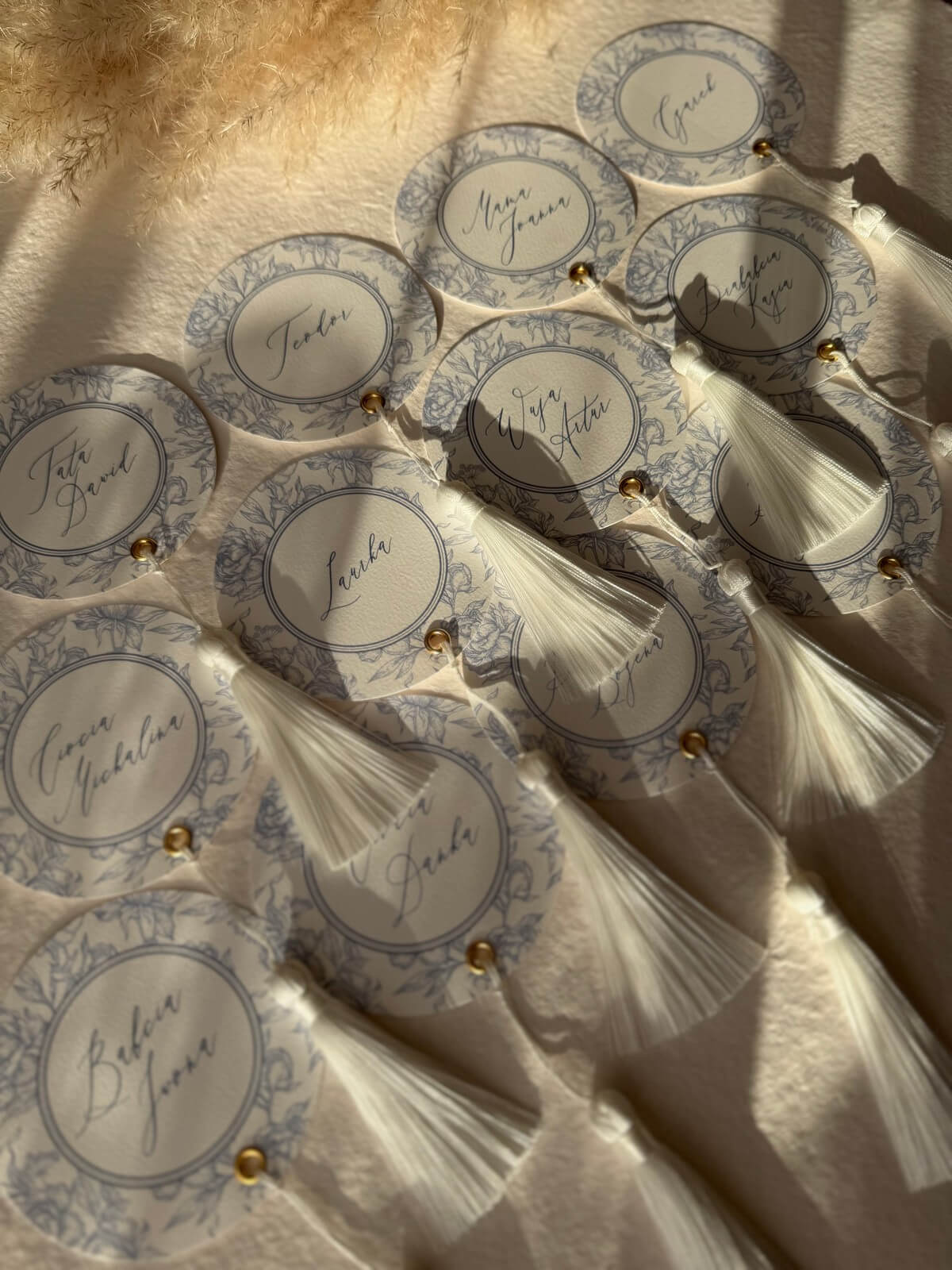 Okrągła winietka o średnicy 9 cm, której tłem jest subtelny ornament z piwonii i ptaków w delikatnym, zgaszonym błękicie. Całość uzupełnia złoty nit i elegancki chwost, które dodają winietce subtelnej elegancji i dekoracyjnego uroku. Winietka stanowi efektowny detal stołu, wprowadzając spójny, stylowy akcent do każdej aranżacji przyjęcia.