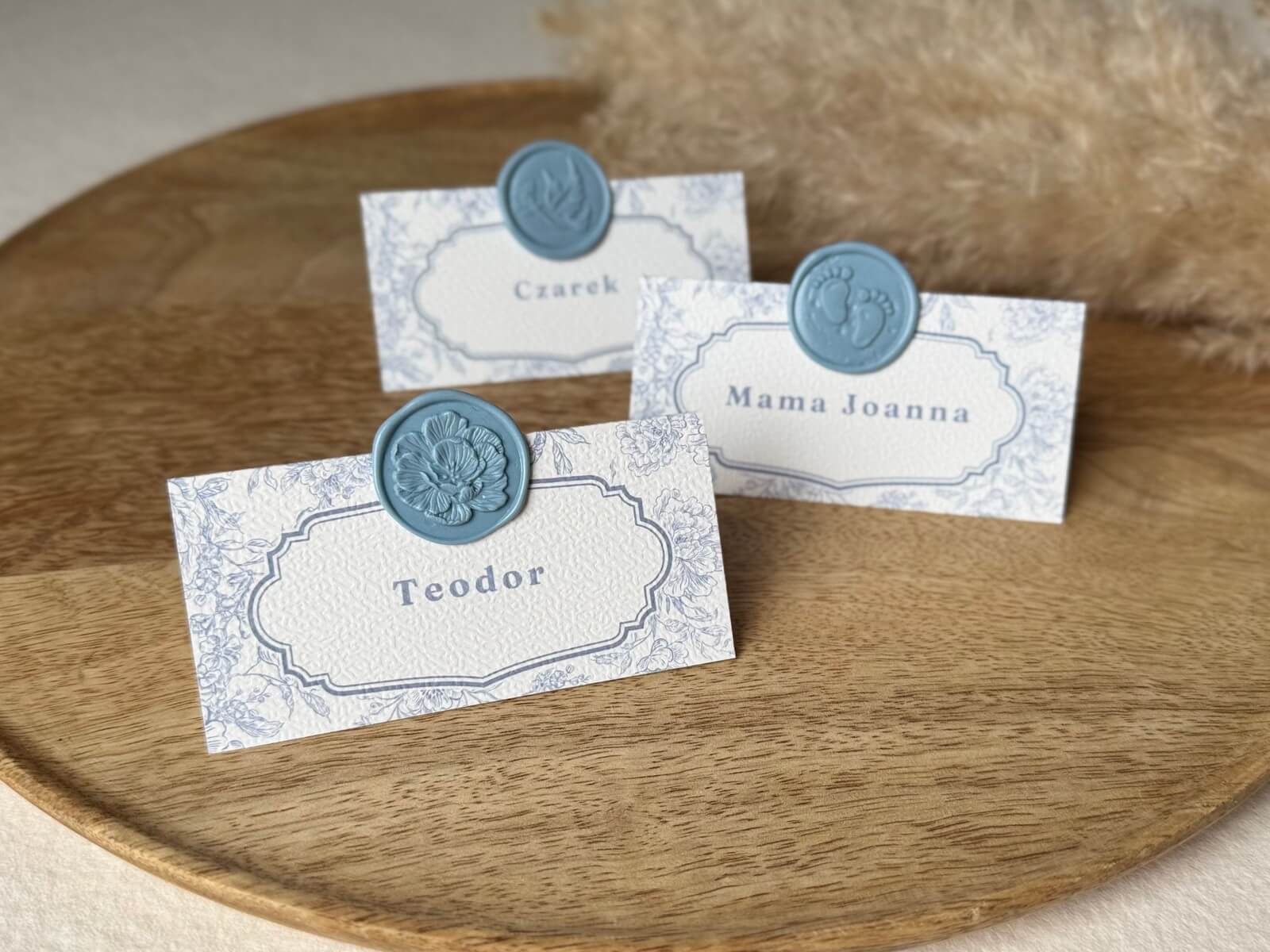 Elegancka winietka stojąca, której tłem jest subtelny ornament z piwonii i ptaków w delikatnym, zgaszonym błękicie. Całość uzupełnia pieczęć lakowa w tym samym odcieniu, nadająca winietce wyjątkowego charakteru. Winietki pięknie zdobią stół, wprowadzając spójny, stylowy akcent do aranżacji przyjęcia podkreślając wyjątkowy charakter uroczystości.