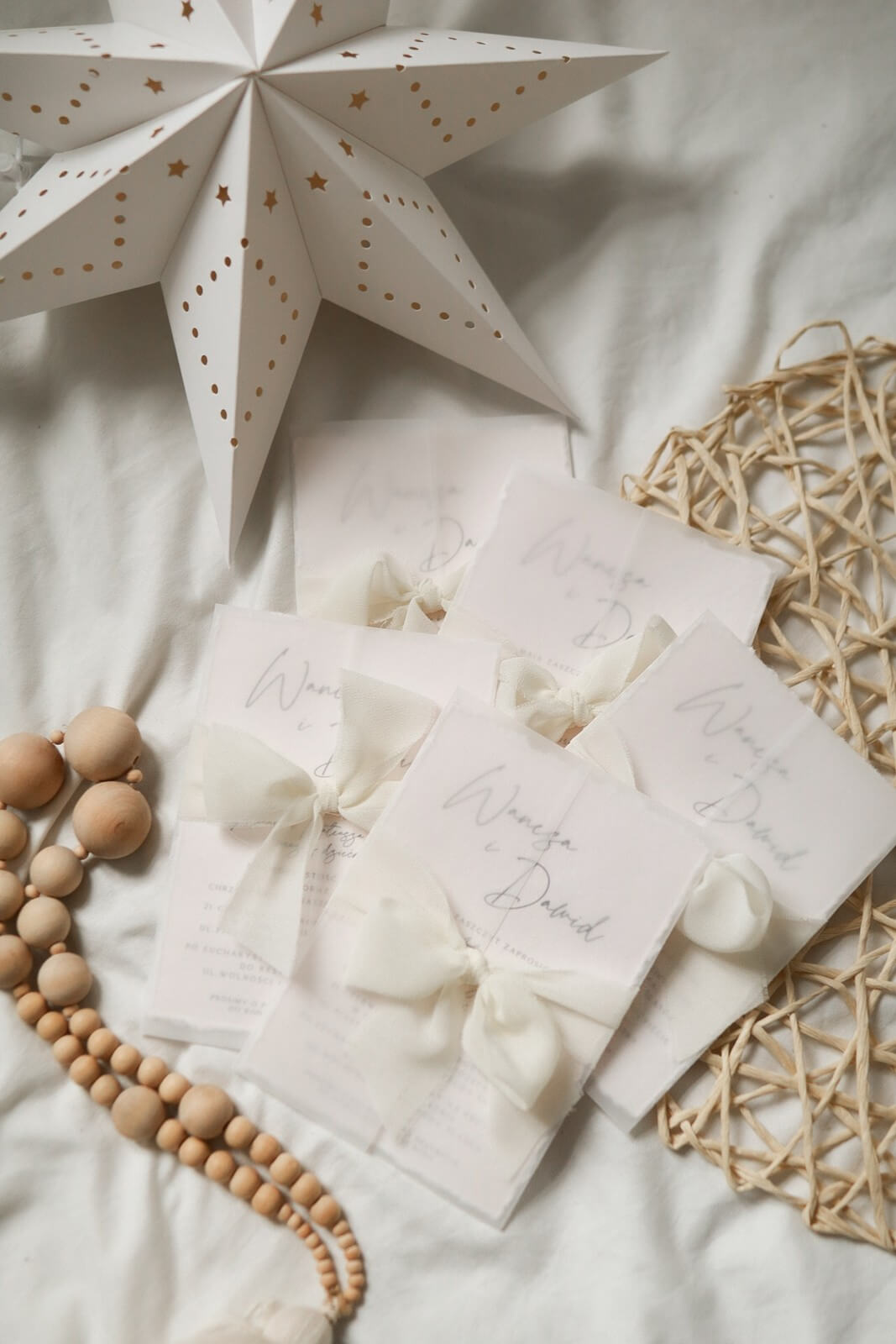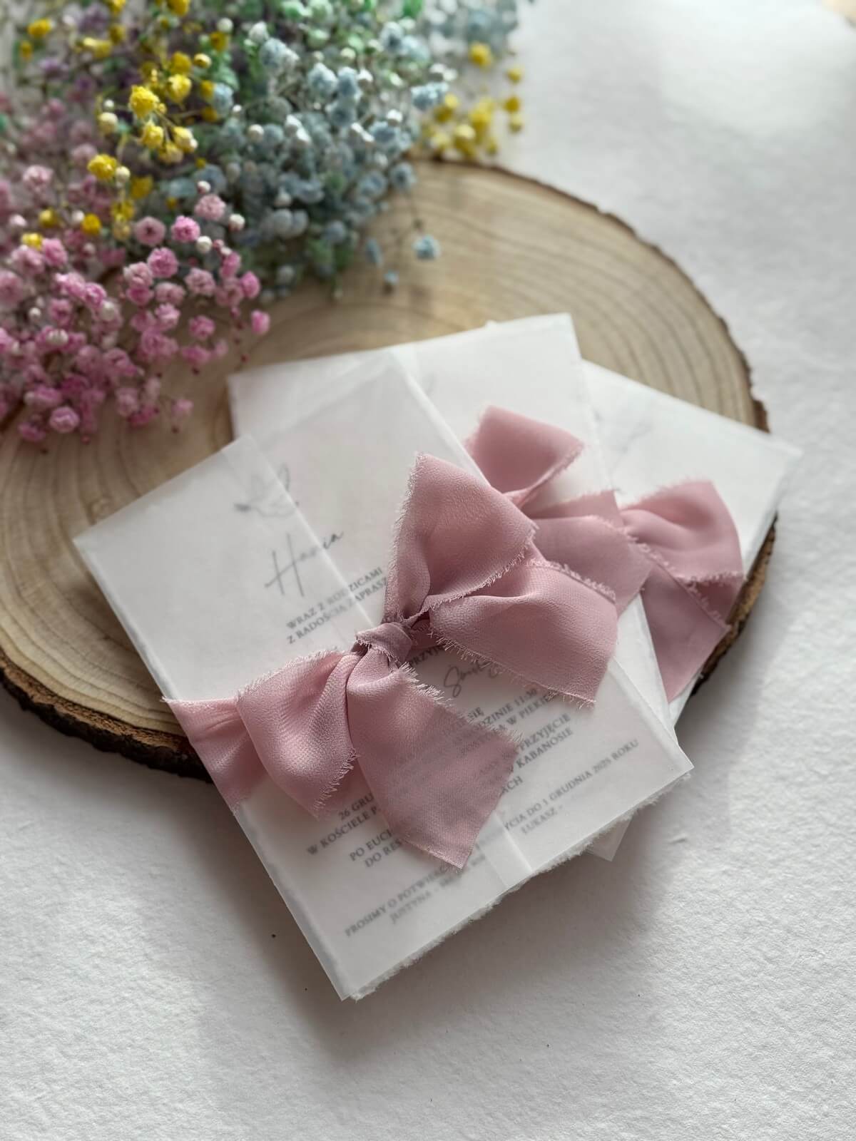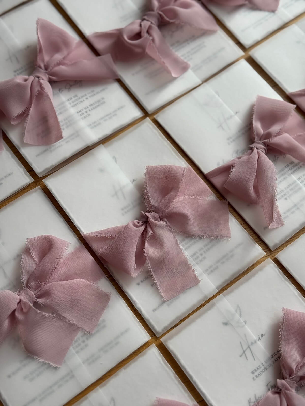 Zaproszenie pełne delikatności i naturalnego uroku, stworzone na ręcznie czerpanym papierze o subtelnej strukturze i postrzępionych brzegach zamknięte w folderze z kalki i przewiązane wstążką szyfonową. Doskonały wybór dla osób kochających minimalizm.