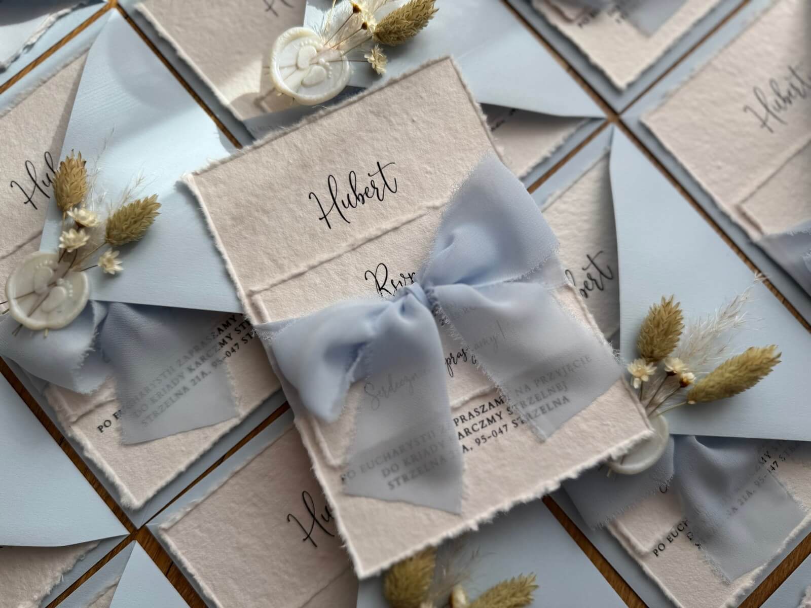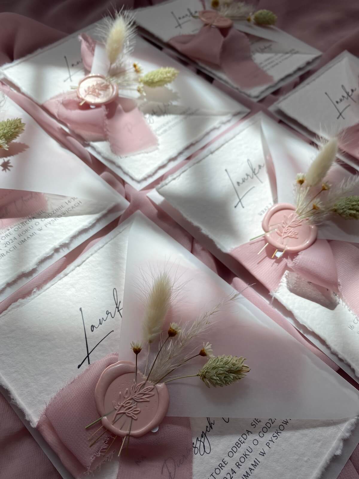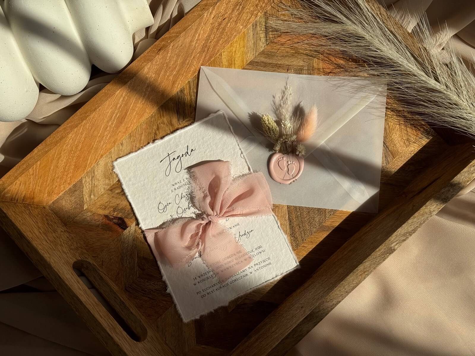 Romantyczne zaproszenie wykonane na ręcznie czerpanym papierze o subtelnej strukturze i postrzępionych brzegach. Ozdobione kokardą z delikatnej szyfonowej wstążki, zamknięte w kopercie lakiem woskowym z wtopionym suszem. Idealne dla osób, które cenią ponadczasową elegancję i miękkie naturalne materiały.
