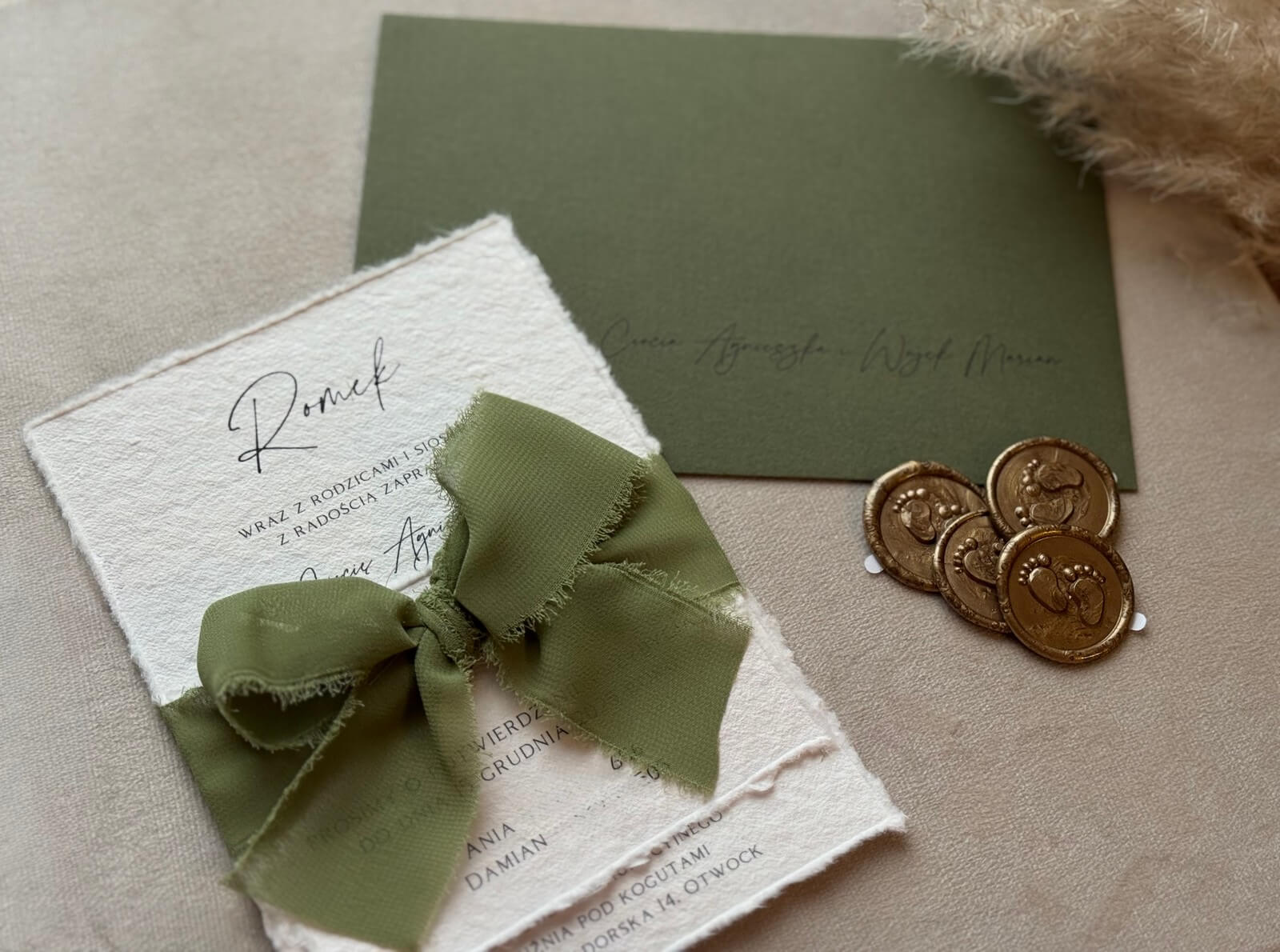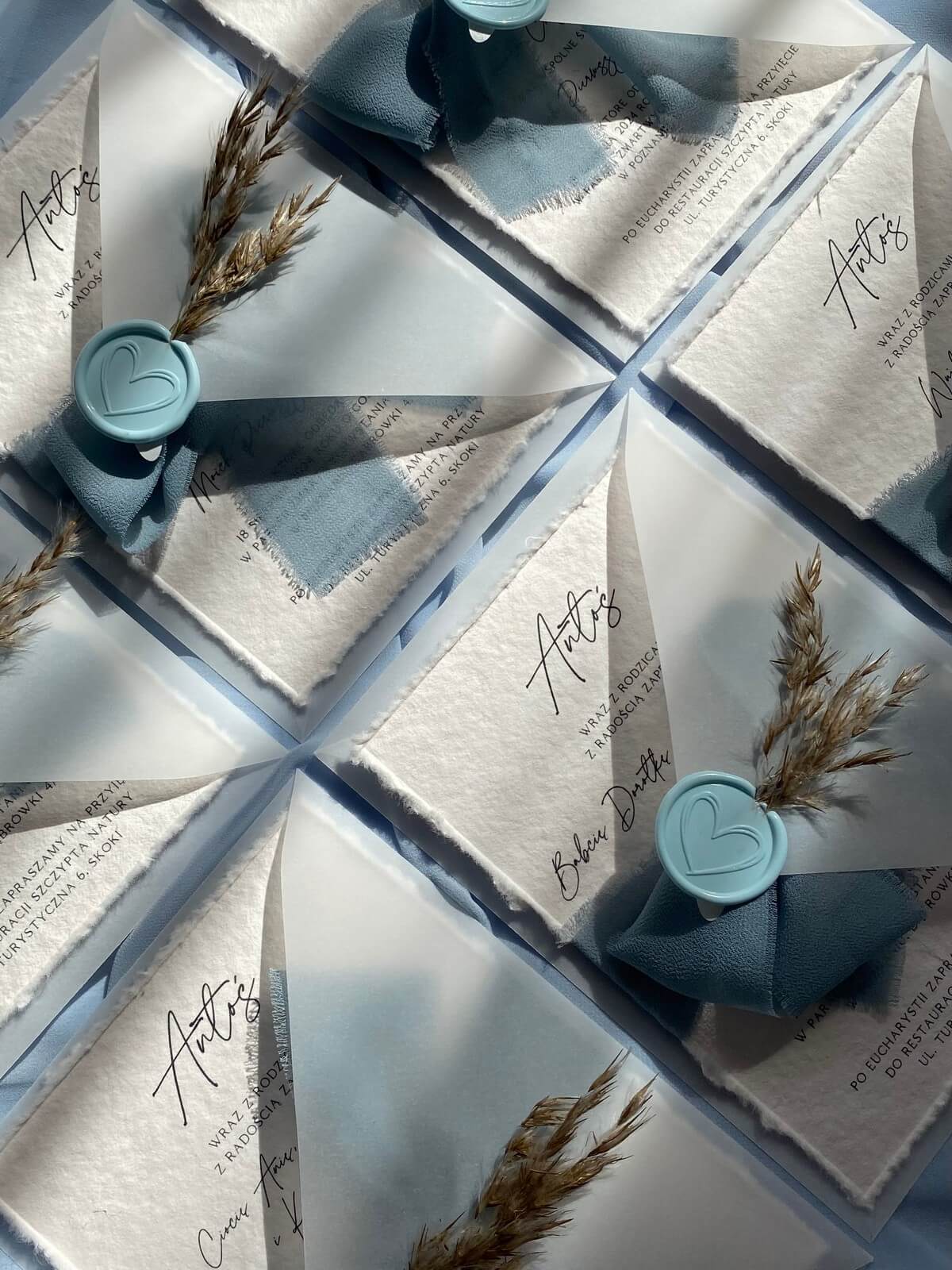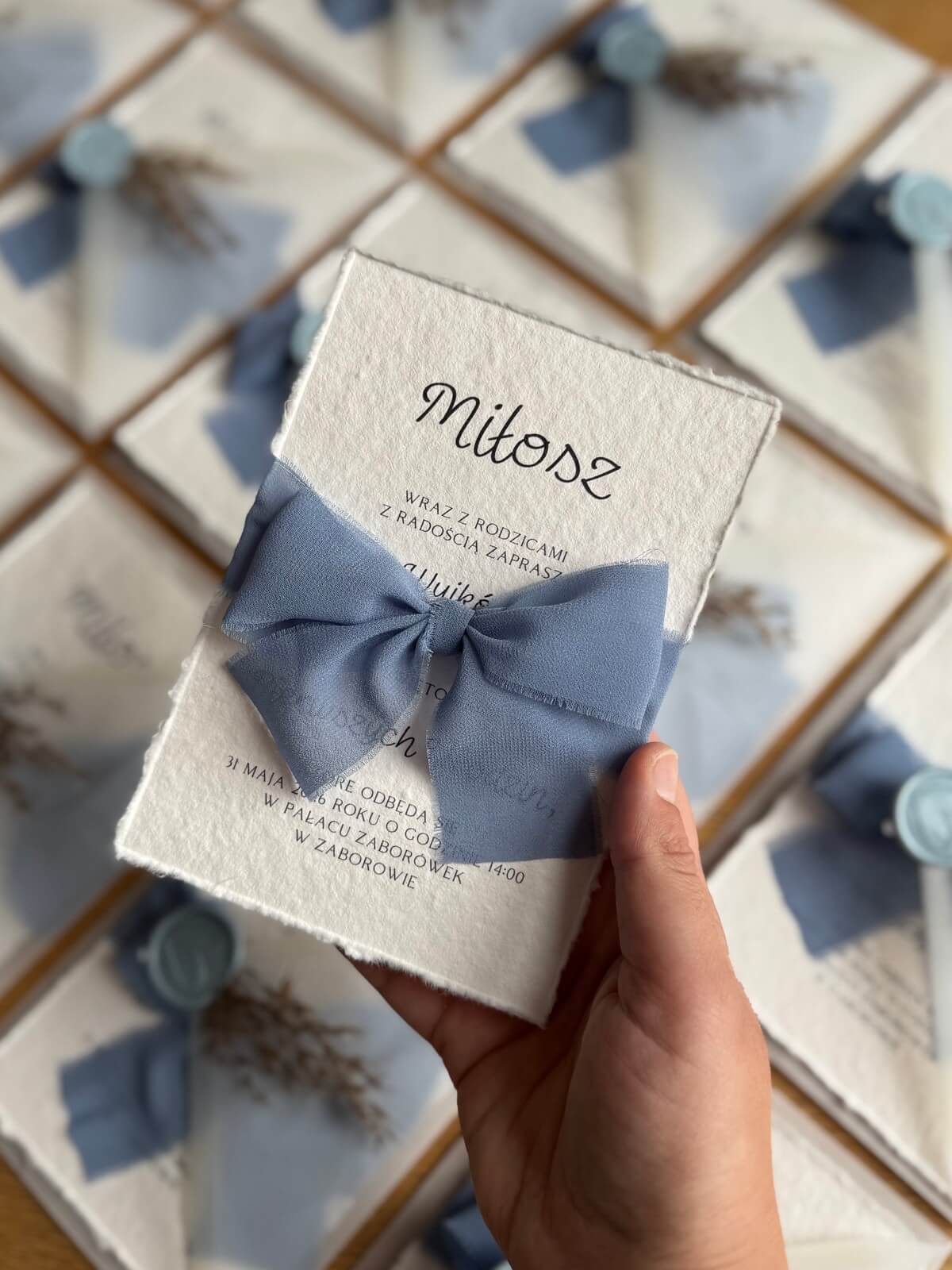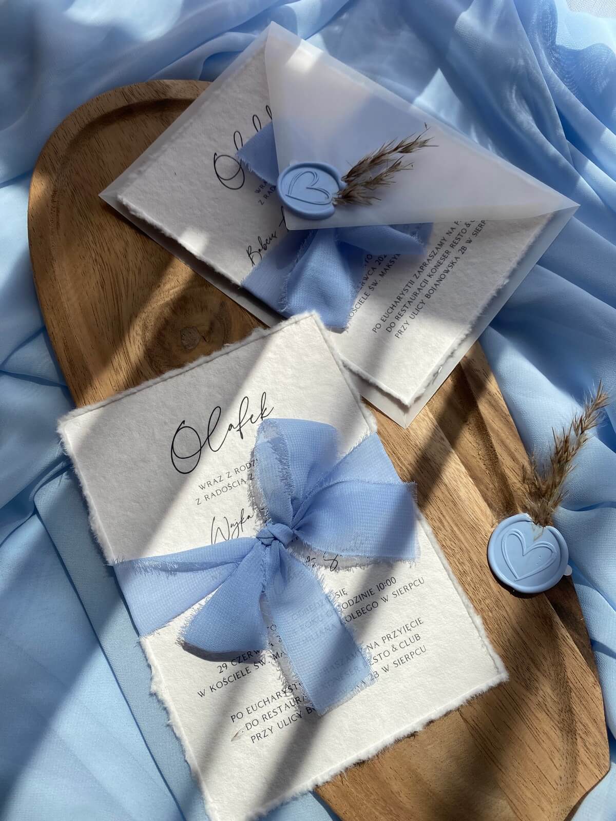 Romantyczne zaproszenie wykonane na ręcznie czerpanym papierze o subtelnej strukturze i postrzępionych brzegach. Ozdobione kokardą z delikatnej szyfonowej wstążki, zamknięte w kopercie lakiem woskowym z wtopionym suszem. Idealne dla osób, które cenią ponadczasową elegancję i miękkie naturalne materiały.