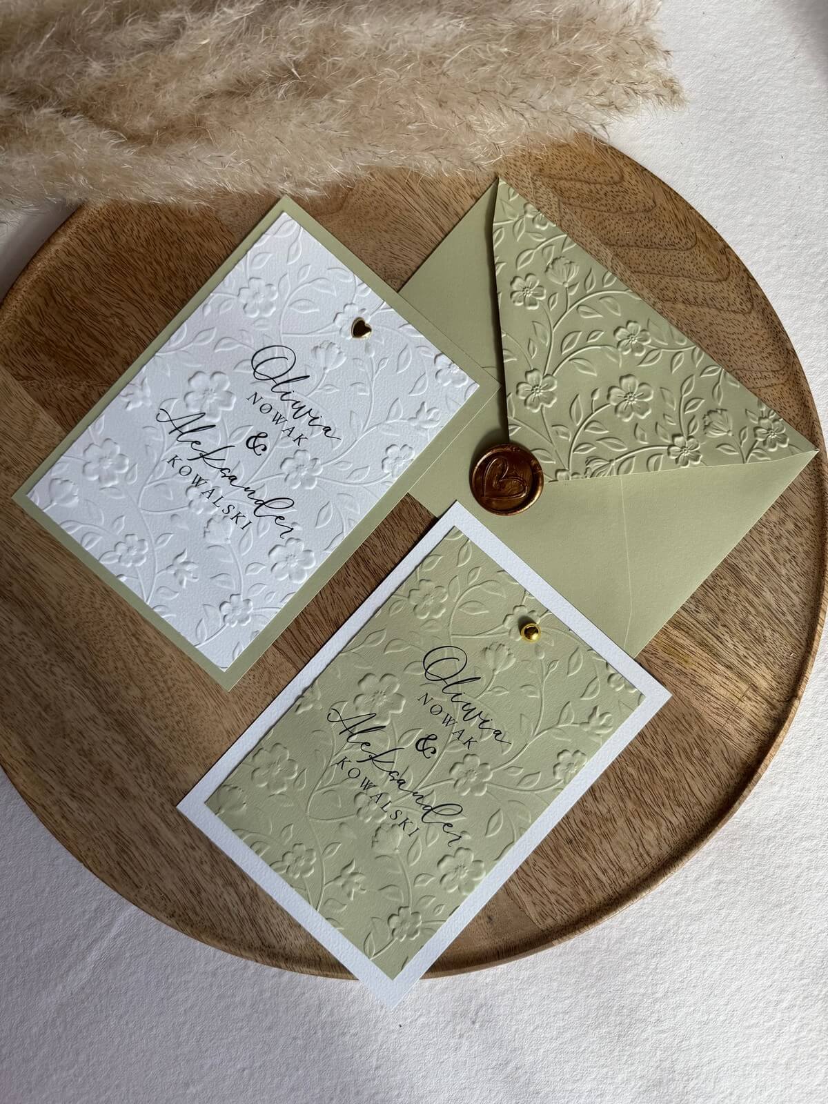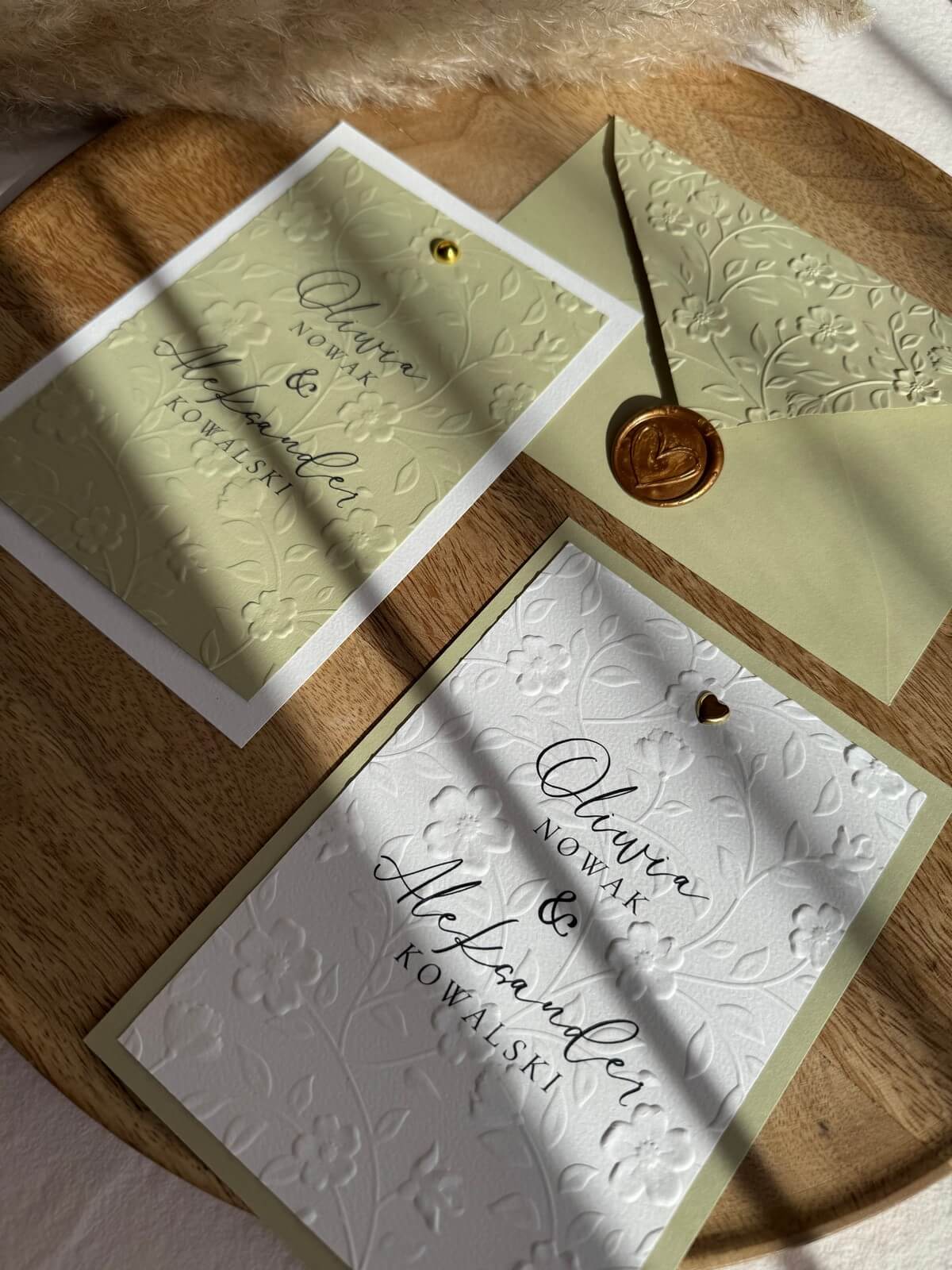 Zaproszenie to dwukartkowa kompozycja, w której jedna z kart tłoczona jest wzorem kwiatów, nadając całości teksturalnej głębi i elegancji. Koperta posiada dopasowaną klapę z tym samym motywem, co tworzy spójną i harmonijną całość. Karty połączone są złotym nitem, który dodaje luksusowego akcentu i podkreśla wyjątkowy charakter zaproszenia. Idealne dla osób ceniących naturalne motywy w eleganckim, minimalistycznym wydaniu.