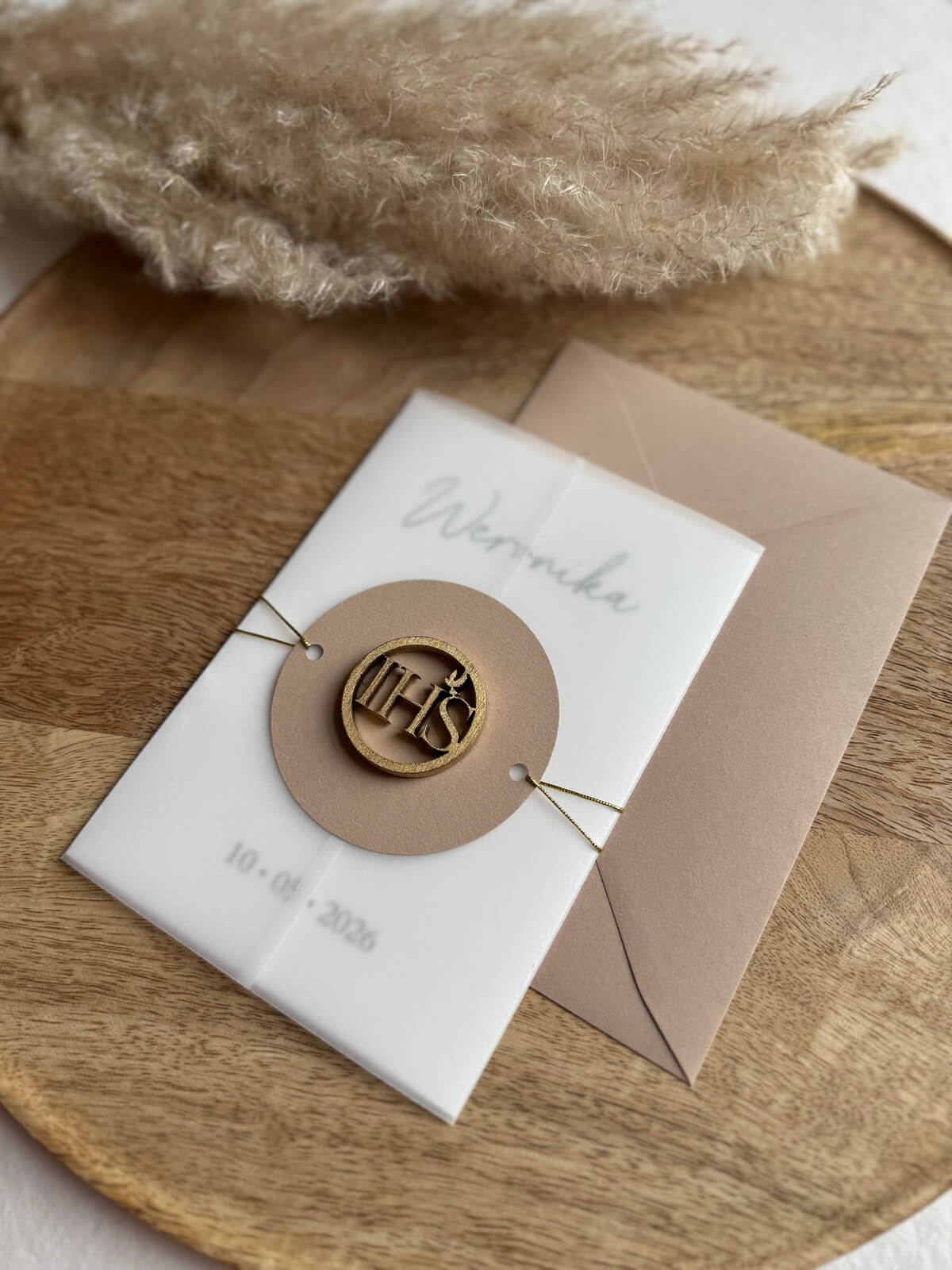 Minimalistyczne zaproszenie utrzymane w naturalnym stylu, ozdobione drewnianym znaczkiem drewniany znaczek IHS, który nadaje całości subtelnego, sakralnego charakteru. Projekt uzupełnia delikatny złoty sznureczek, przewiązany wokół zaproszenia, podkreślający jego elegancję i lekkość.