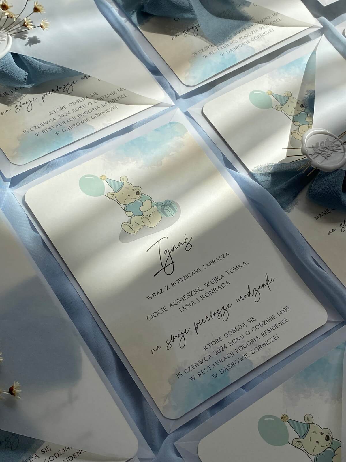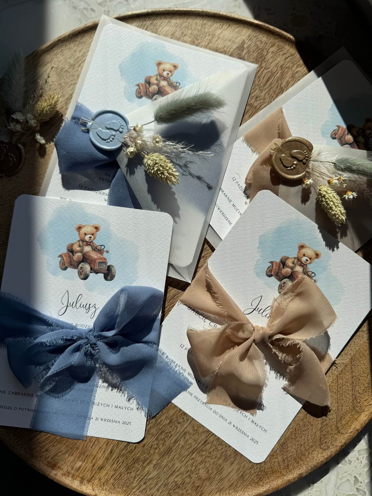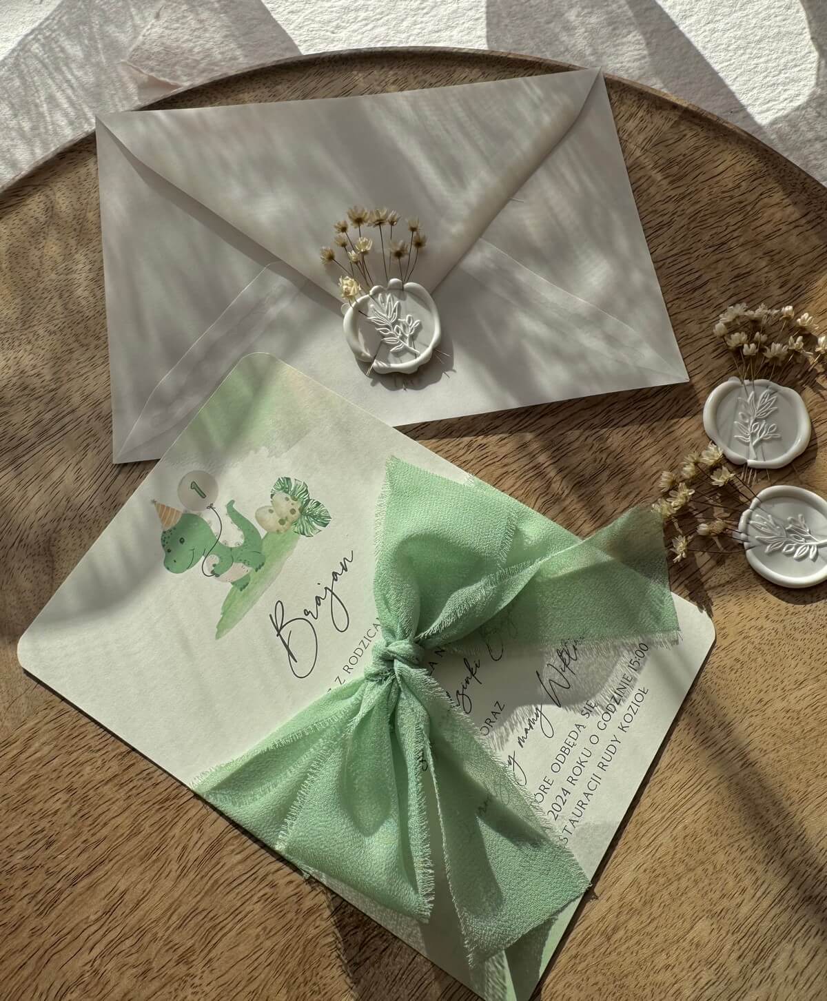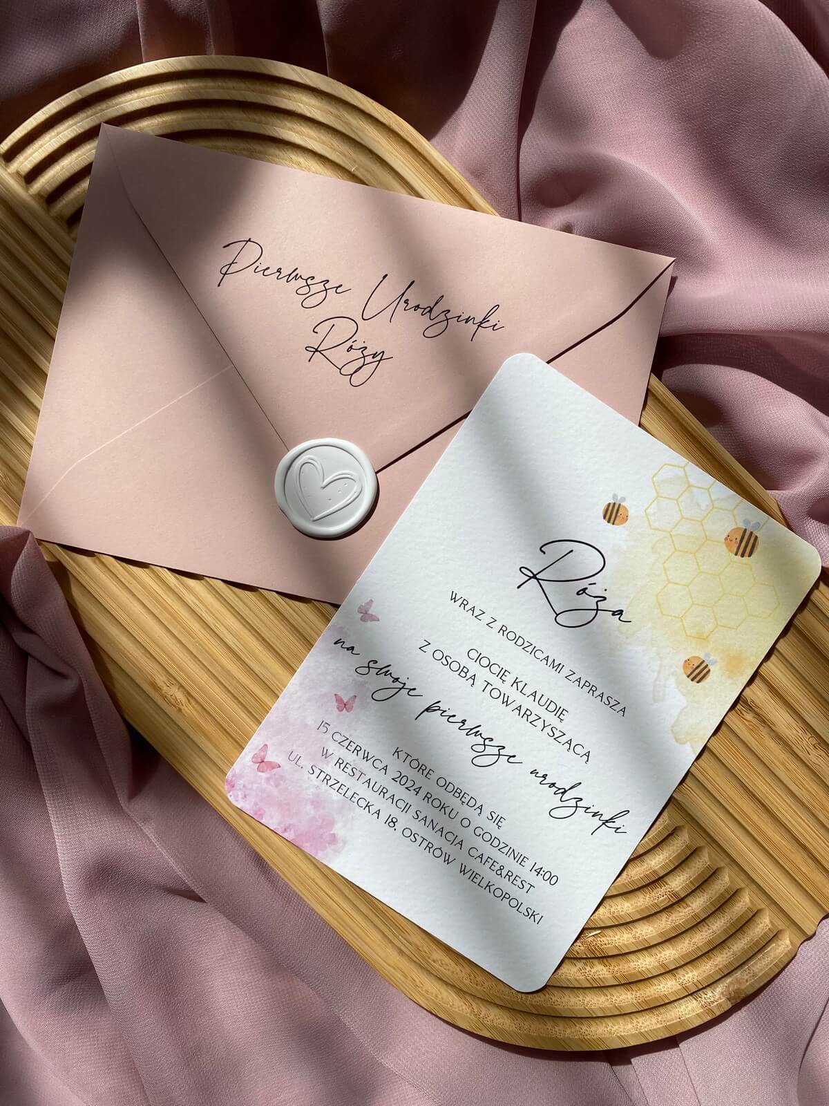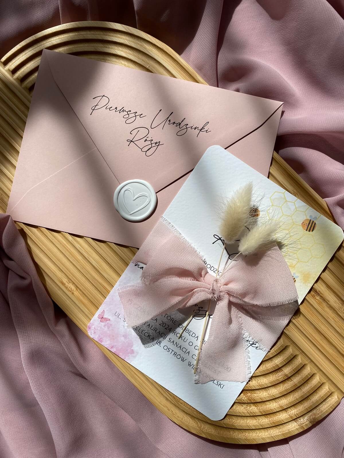 Zaproszenie wykonane na fakturowanym papierze o gramaturze 250g, z możliwością indywidualnej grafiki dopasowanej do motywu imprezy. Przewiązane wstążką idealnie harmonizującą z kolorystyką przyjęcia i umieszczone w kopercie z kalki lub innego papieru, zamknięte lakową pieczęcią z wtapianym suszem. Całość tworzy elegancką, spersonalizowaną kompozycję pełną klasy i detali.