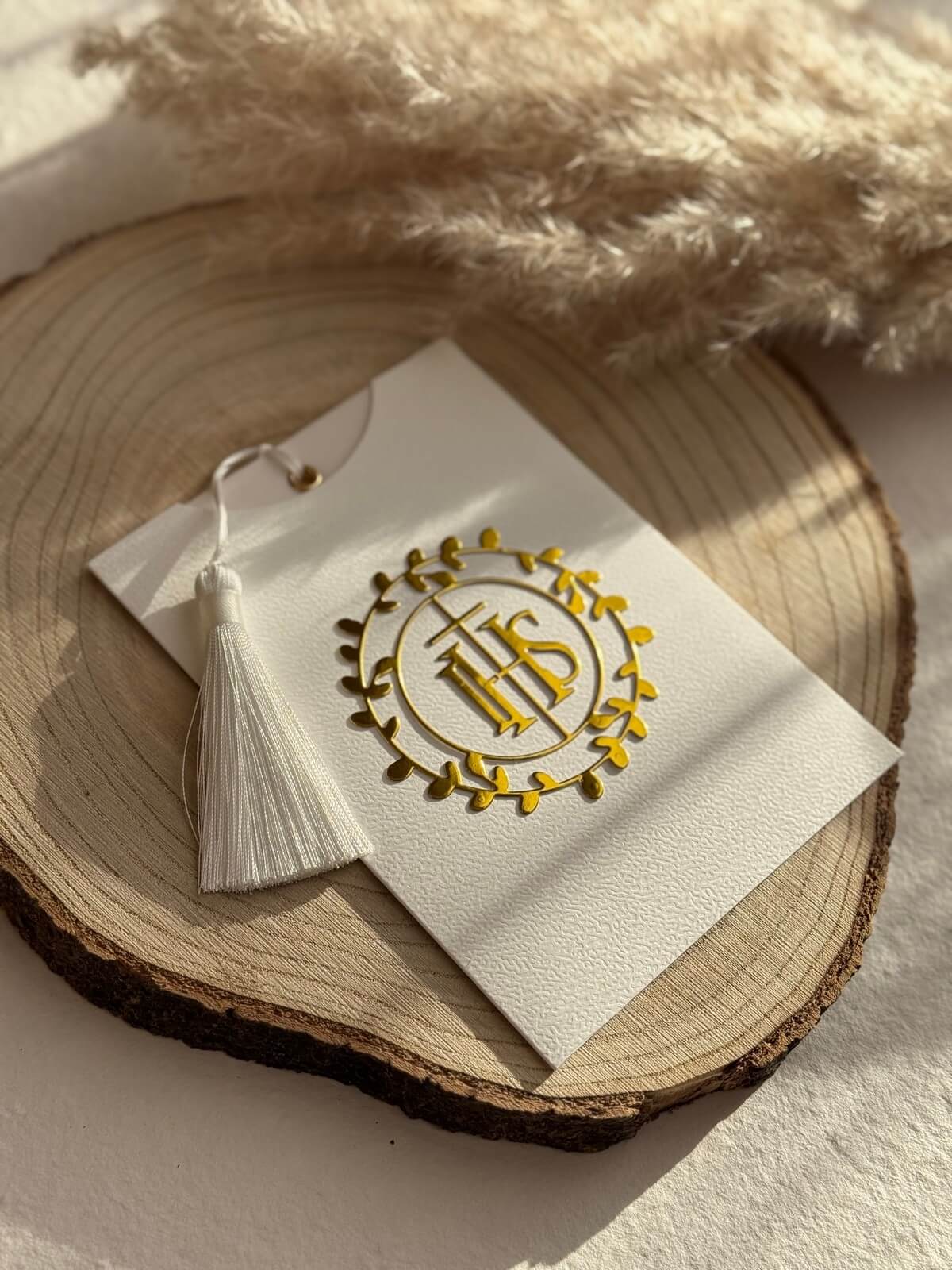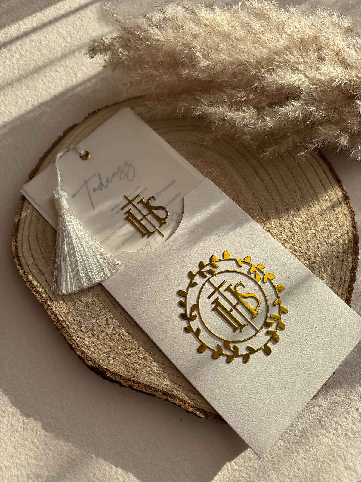 Odkryj eleganckie zaproszenie, które zachwyca subtelną formą i detalami. Całość ukryta jest w folderze ozdobionym symbolem IHS, z którego delikatnie wysuwa się dwukartkowe zaproszenie. Pierwsza karta wykonana jest z transparentnej kalki z nadrukiem IHS, nadając całości lekkości i sakralnego charakteru. Druga biała, klasyczna na wysokiej jakości papierze – zawiera właściwy tekst zaproszenia. Obie części połączone są dekoracyjnym nitem i eleganckim chwostem, tworząc wyjątkową, spójną kompozycję