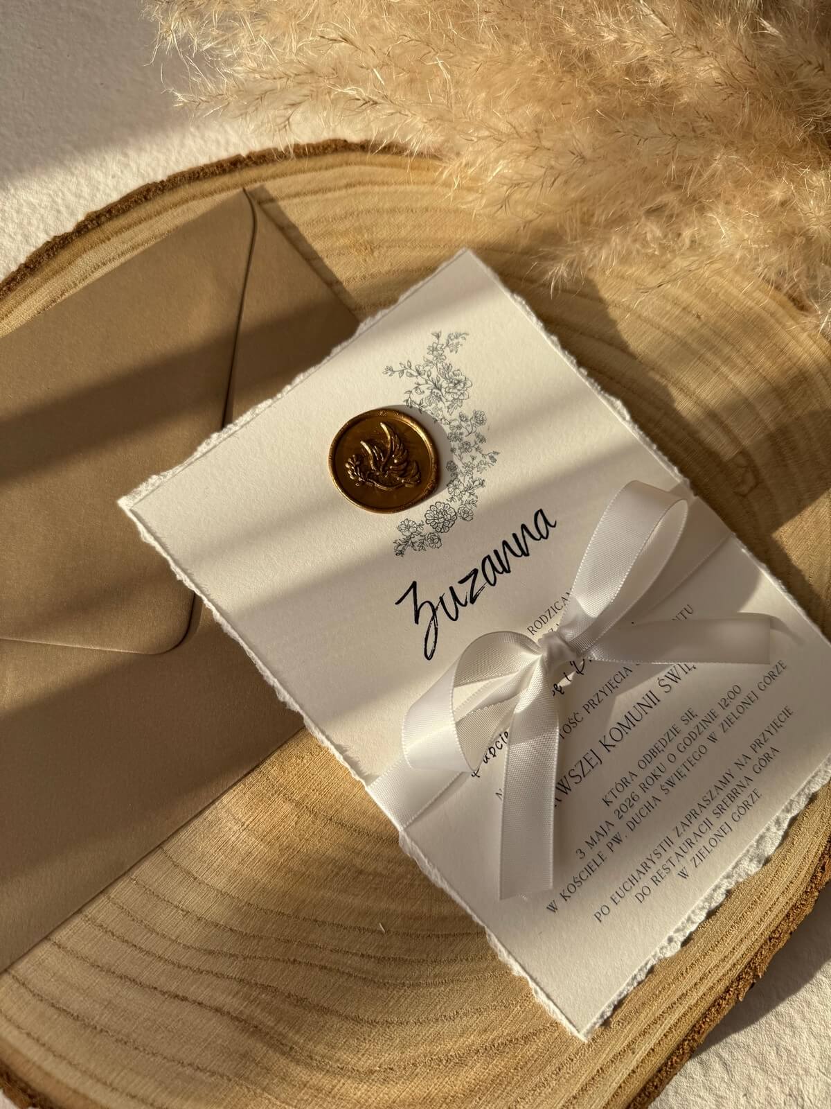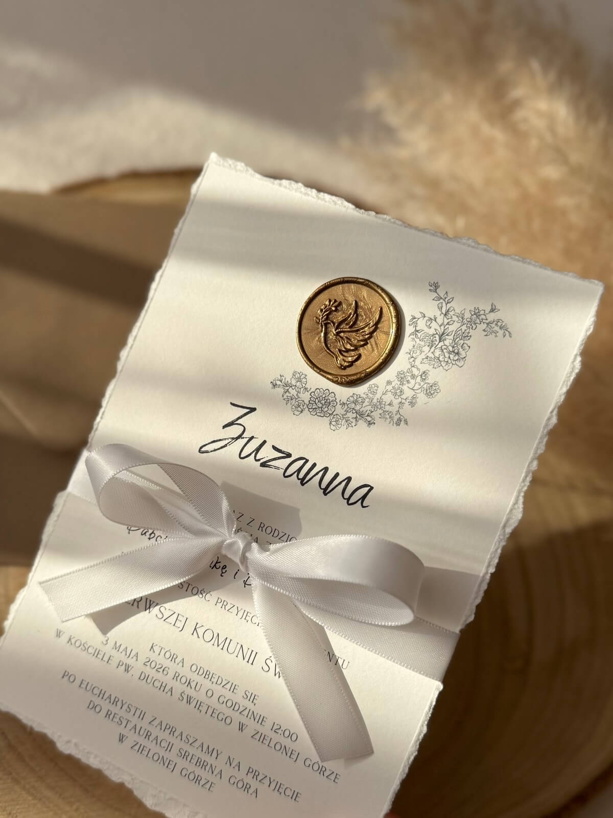 Zaproszenie uzupełnia dekoracyjna pieczęć woskowa oraz kokarda z delikatnej satynowej wstążki, tworząc harmonijną i wyjątkowo estetyczną kompozycję.