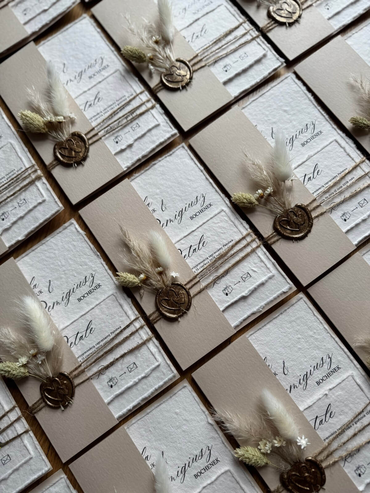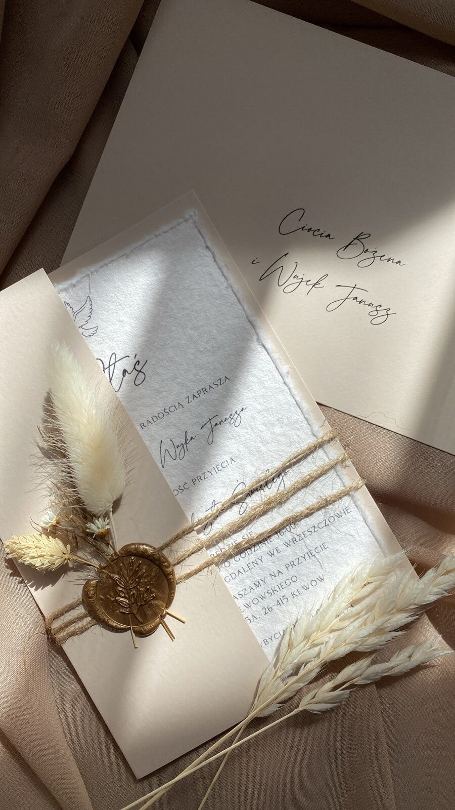 Eleganckie zaproszenie wykonane na ręcznie czerpanym papierze o miękkiej strukturze i postrzępionych brzegach. Umieszczone w minimalistycznym folderze, przewiązane jutowym sznurkiem, z pieczęcią woskową, w której zatopiono suszone rośliny. Połączenie naturalnych materiałów i starannego wykończenia tworzy kompozycję pełną delikatności i klasy.