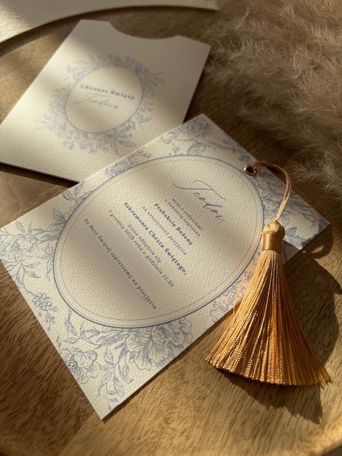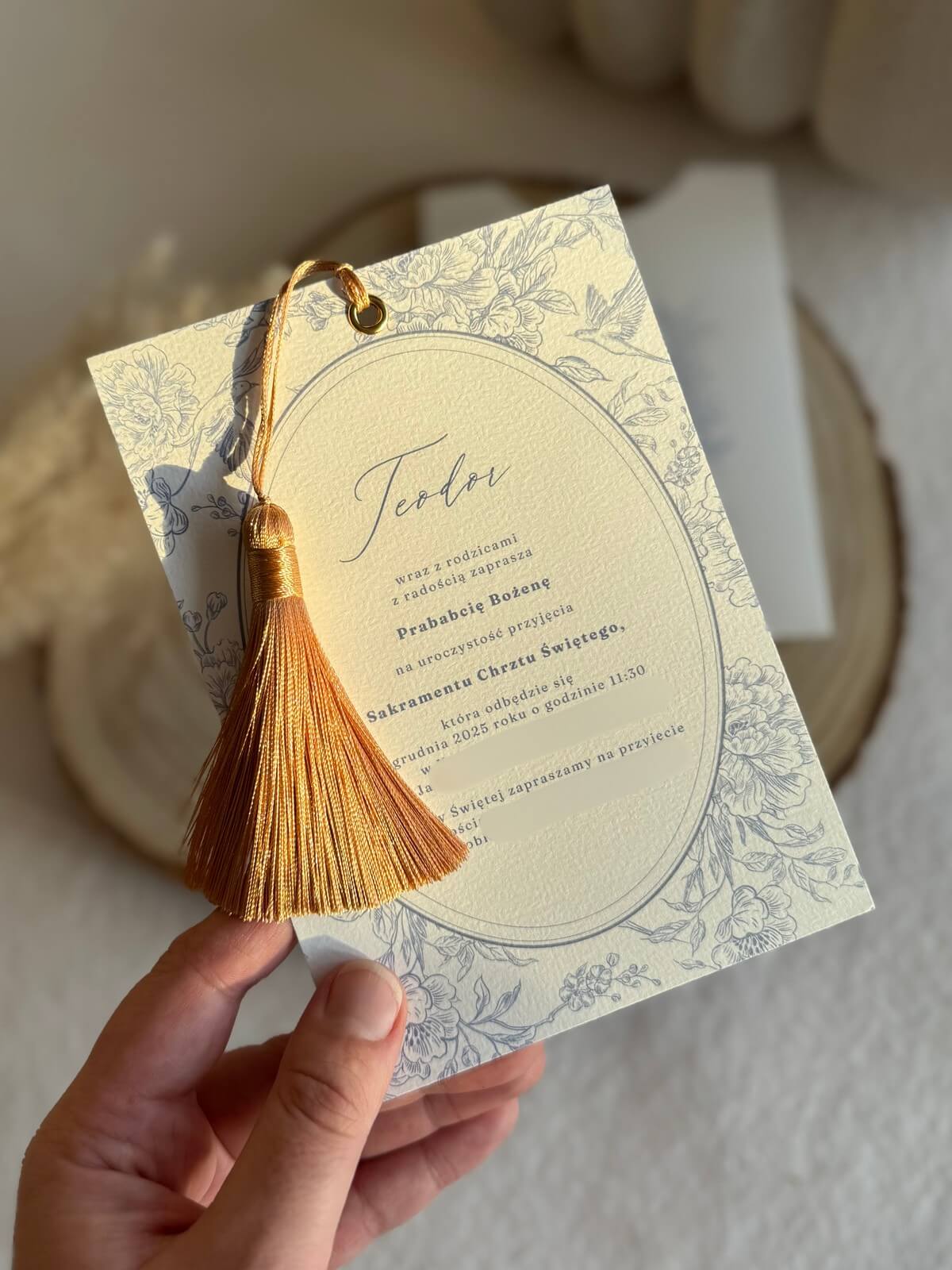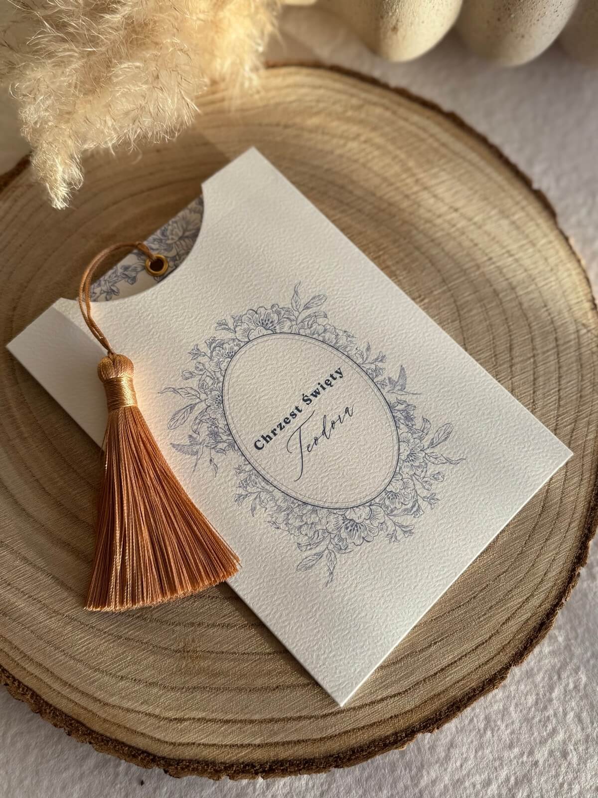 Zaproszenie Theo to połączenie subtelnej elegancji i delikatnej natury, wykonane na wysokiej jakości papierze. Folder zdobi grafika kwiatów i ptaków w zgaszonym niebieskim odcieniu, a wnętrze zaproszenia utrzymane jest w tej samej, harmonijnej tonacji. Biały chwost i dekoracyjny nit dodają całości lekkości i luksusowego charakteru, tworząc wyjątkową oprawę każdej uroczystości.