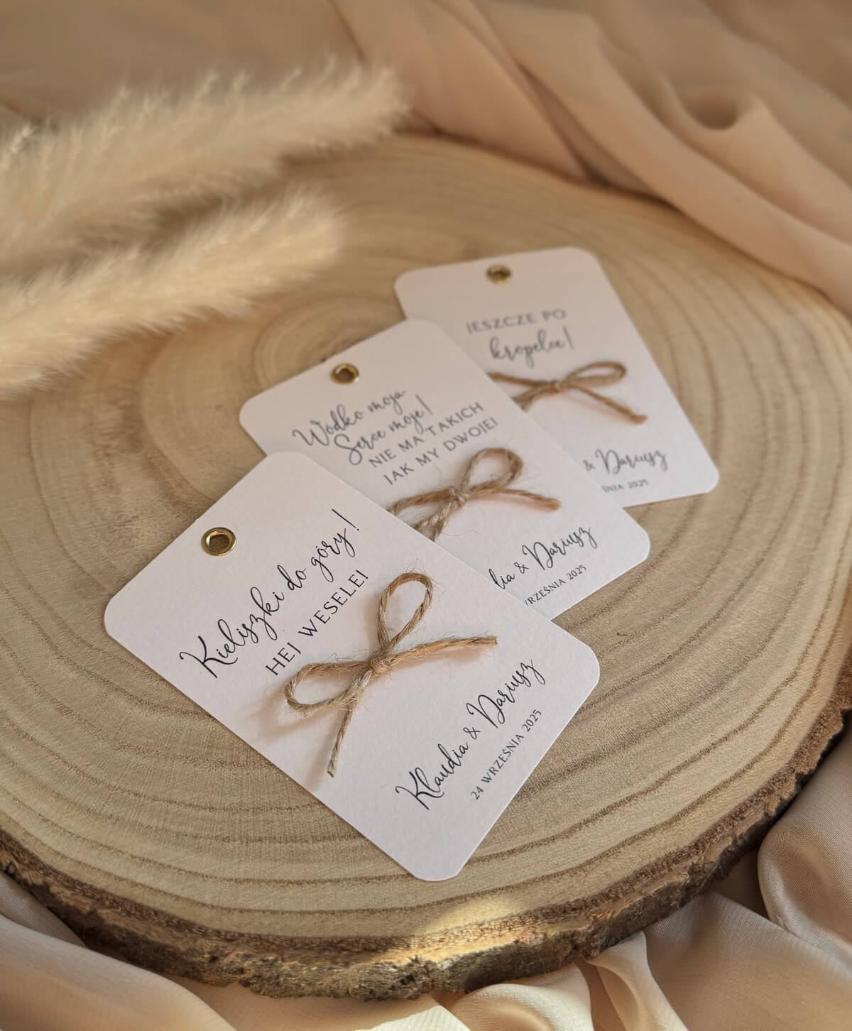 Delikatna zawieszka w stylu rustykalnym, idealna do ozdobienia butelek z alkoholem na wesele czy inne przyjęcia w naturalnym klimacie. Wykonana z wysokiej jakości papieru i ozdobiona maleńką kokardką ze sznurka jutowego dodaje uroku i prostoty, która pięknie komponuje się z drewnem, zielenią i lnem.